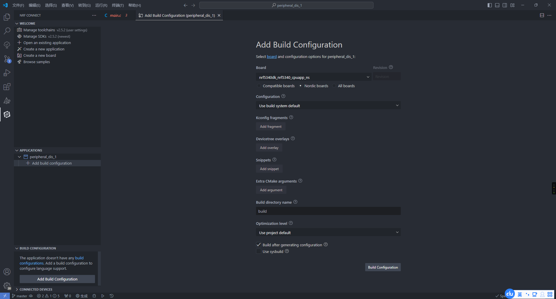 然后创建编译配置并编译,这里根据自己身边的板子选择型号,我的是nrf5340,所以选择如下
