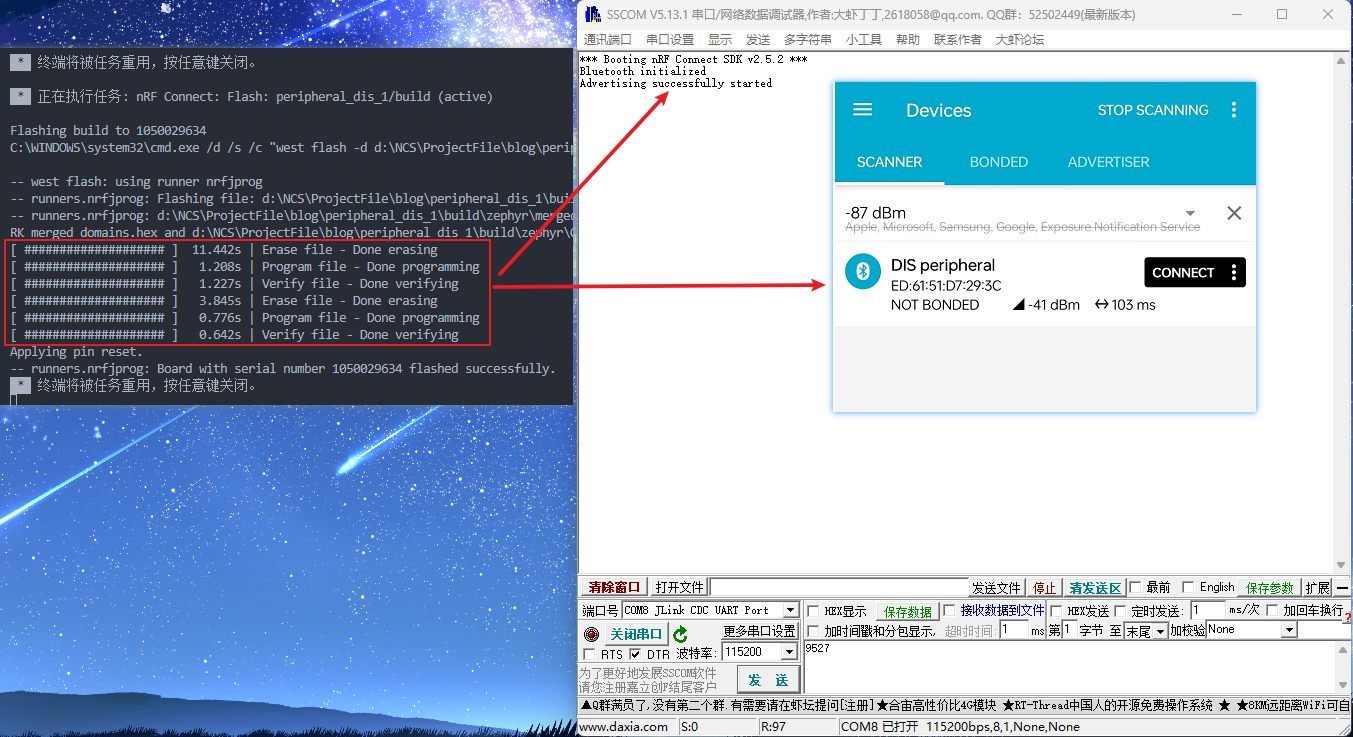 烧录成功后可以看到DIS设备的广播信息和串口工具的log