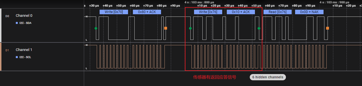 用风枪吹了一下传感器,防止虚焊的情况。再测试,还是一样的情况。所以可能的问题就是iic器件地址问题。sensor有两个可选地址,0x76&0x77.选择另一个之后,如下图所示,