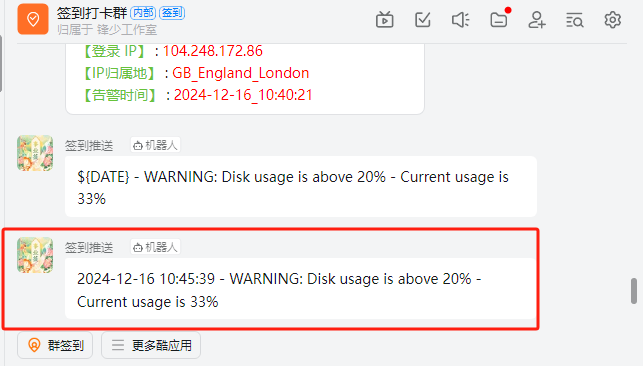 当脚本发现服务的根目录使用量超过80%时,就会给钉钉发一条告警消息,如下图所示。
