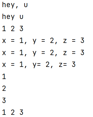 print('hey, u') print('hey','u') x, y, z = 1,2,3 print(x,y,z) print('x = %d, y = %d, z = %d'%(x,y,z)) print('x = {}, y = {}, z = {}'.format(x,y,z)) print(f'x = {x}, y= {y}, z= {z}') print(x) print(y) print(z) print(x, end=' ') print(y, end=' ') print(z)