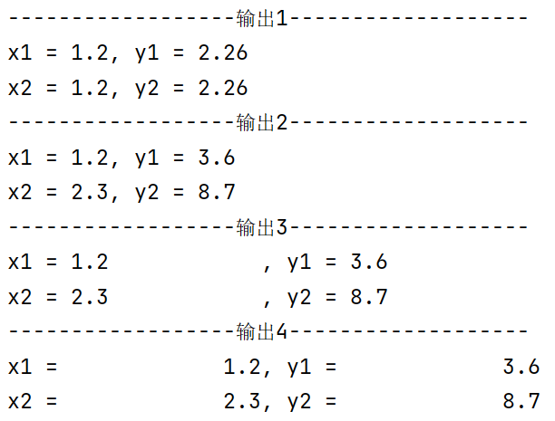 x1,y1 = 1.2, 3.57 x2,y2 = 2.26, 8.7 print('{:-^40}'.format('输出1')) print('x1 = {}, y1 = {}'.format(x1,x2)) print('x2 = {}, y2 = {}'.format(x1,x2)) print('{:-^40}'.format('输出2')) print('x1 = {:.1f}, y1 = {:.1f}'.format(x1,y1)) print('x2 = {:.1f}, y2 = {:.1f}'.format(x2,y2)) print('{:-^40}'.format('输出3')) print('x1 = {:<15.1f}, y1 = {:<15.1f}'.format(x1,y1)) print('x2 = {:<15.1f}, y2 = {:<15.1f}'.format(x2,y2)) print('{:-^40}'.format('输出4')) print('x1 = {:>15.1f}, y1 = {:>15.1f}'.format(x1,y1)) print('x2 = {:>15.1f}, y2 = {:>15.1f}'.format(x2,y2))