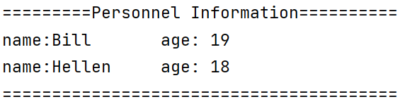 name1, age1 = 'Bill', 19 name2, age2 = 'Hellen', 18 title = 'Personnel Information' print(f'{title:=^40}') print(f'name:{name1:10} age:{age1:3}') print(f'name:{name2:10} age:{age2:3}') print(40*'=')