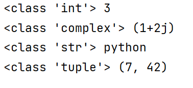 r1 = eval('1 + 2') print(type(r1),r1) r2 = eval('1+2j') print(type(r2),r2) r3 = eval('"python"') print(type(r3),r3) r4 = eval('7,42') print(type(r4),r4)