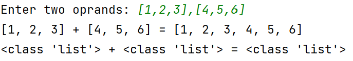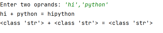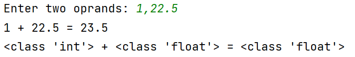 x,y = eval(input('Enter two oprands: ')) ans = x + y print(f'{x} + {y} = {ans}') print(f'{type(x)} + {type(y)} = {type(ans)}')