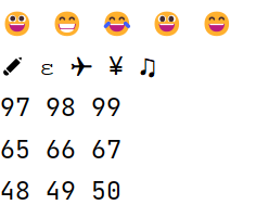 print(chr(0x1f600), end = " ") print(chr(0x1f601), end = " ") print(chr(0x1f602), end = " ") print(chr(0x1f603), end = " ") print(chr(0x1f604)) print(chr(10000), end = " ") print(chr(0x025b), end = " ") print(chr(0x2708), end = " ") print(chr(0x00A5), end = " ") print(chr(0x266b)) print(ord('a'),end = " ") print(ord('b'),end = " ") print(ord('c')) print(ord('A'),end = " ") print(ord('B'),end = " ") print(ord('C')) print(ord('0'),end = " ") print(ord('1'),end = " ") print(ord('2'))