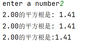 import math n = float(input('enter a number')) ans1 = n**0.5 ans2 = pow(n,0.5) ans3 = math.sqrt(n) print('%.2f的平方根是: %.2f' %(n,ans1)) print('{:.2f}的平方根是: {:.2f}'.format(n,ans2)) print(f'{n:.2f}的平方根是:{ans3:.2f}')