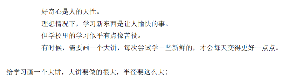 import math text = ''' 好奇心是人的天性。 理想情况下,学习新东西是让人愉快的事。 但学校里的学习似乎有点像苦役。 有时候,需要画一个大饼,每次尝试学一些新鲜的,才会每天变得更好一点点。 ''' print(text) r = float(input('给学习画一个大饼,大饼要做的很大,半径要这么大: ')) circle = 2*math.pi*r print(f'绕起来,大饼的圆周有这么长, {circle}, 够不够激发你探索未知的动力...')