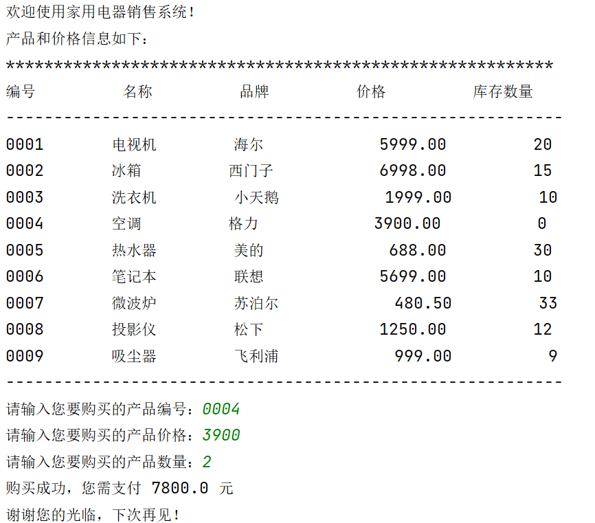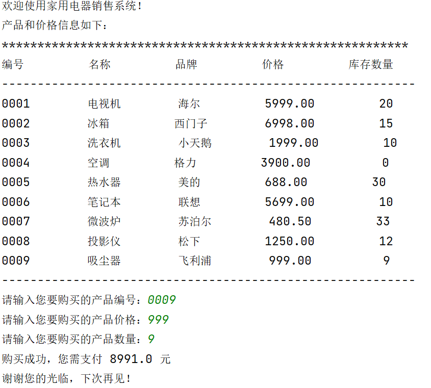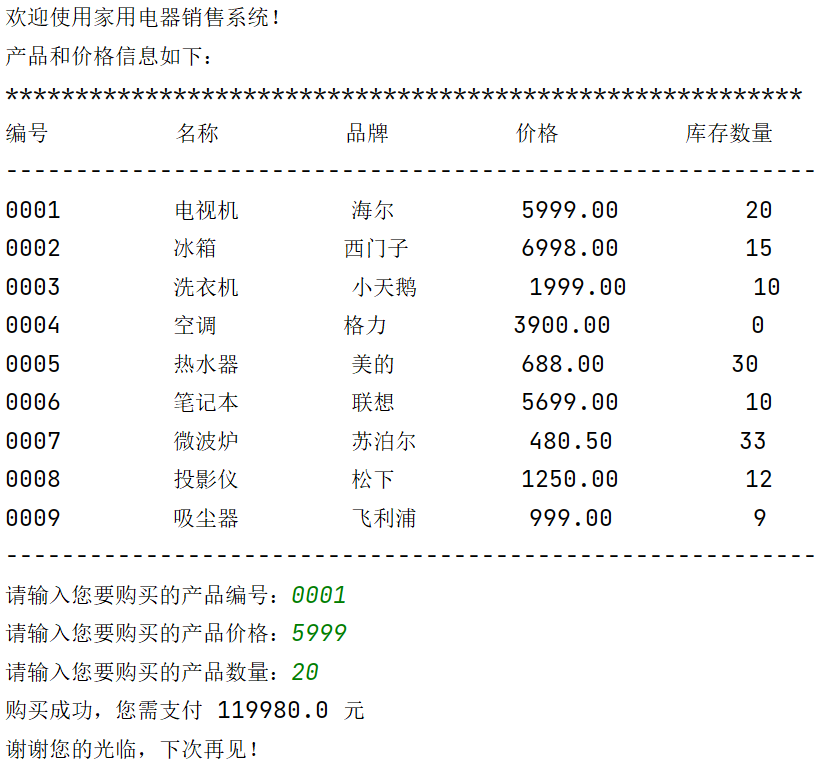 print('欢迎使用家用电器销售系统!') print('产品和价格信息如下:') print('*'*57) print('%-10s'%'编号', '%-10s'%'名称', '%-10s'%'品牌', '%-10s'%'价格', '%-10s'%'库存数量') print('-'*58) print('%-10s'%'0001', '%-10s'%'电视机', '%-10s'%'海尔', '%10.2f'%5999.00, '%10d'%20) print('%-10s'%'0002', '%-10s'%'冰箱', '%-10s'%'西门子', '%10.2f'%6998.00, '%10d'%15) print('%-10s'%'0003', '%-10s'%'洗衣机', '%-10s'%'小天鹅', '%10.2f'%1999.00, '%10d'%10) print('%-10s'%'0004', '%-10s'%'空调', '%-10s'%'格力', '%10.2f'%3900.00, '%10d'%0) print('%-10s'%'0005', '%-10s'%'热水器', '%-10s'%'美的', '%10.2f'%688.00, '%10d'%30) print('%-10s'%'0006', '%-10s'%'笔记本', '%-10s'%'联想', '%10.2f'%5699.00, '%10d'%10) print('%-10s'%'0007', '%-10s'%'微波炉', '%-10s'%'苏泊尔', '%10.2f'%480.50, '%10d'%33) print('%-10s'%'0008', '%-10s'%'投影仪', '%-10s'%'松下', '%10.2f'%1250.00, '%10d'%12) print('%-10s'%'0009', '%-10s'%'吸尘器', '%-10s'%'飞利浦', '%10.2f'%999.00, '%10d'%9) print('-'*58) product_id = input('请输入您要购买的产品编号:') price = float(input('请输入您要购买的产品价格:')) count = int(input('请输入您要购买的产品数量:')) print('购买成功,您需支付', price*count, '元') print('谢谢您的光临,下次再见!')