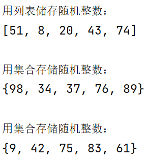 import random print('用列表储存随机整数:') lst = [random.randint(0,100) for i in range(5)] print(lst) print('\n用集合存储随机整数:') s1 = {random.randint(0,100) for i in range(5)} print(s1) print('\n用集合存储随机整数:') s2 = set() while len(s2) < 5: s2.add(random.randint(0,100)) print(s2)