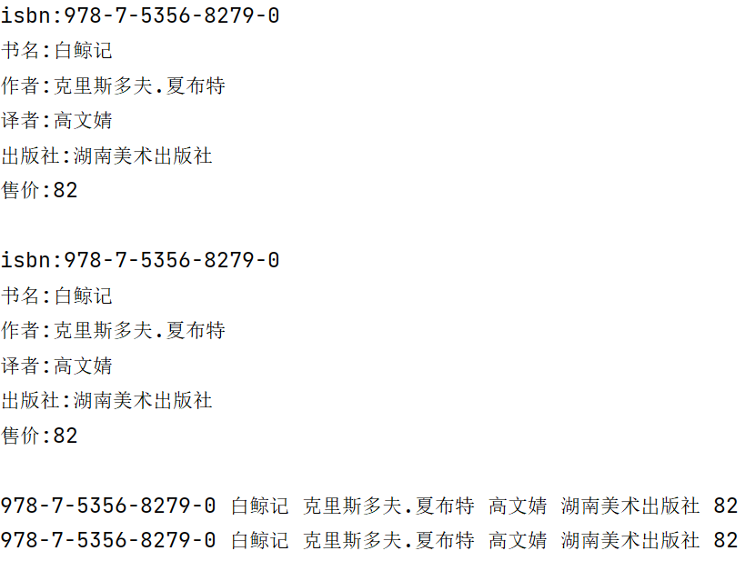 #字典遍历 book_info = {'isbn':'978-7-5356-8279-0', '书名':'白鲸记', '作者':'克里斯多夫.夏布特', '译者':'高文婧', '出版社':'湖南美术出版社', '售价':82} #遍历key-value对:实现方式1 for key,value in book_info.items(): print(f'{key}:{value}') print() #遍历key-value对:实现方式2 for item in book_info.items(): print(f'{item[0]}:{item[1]}') print() #遍历值:实现方式1 for value in book_info.values(): print(value,end = ' ') print() #遍历值:实现方式2 for key in book_info.keys(): print(book_info[key],end = ' ')