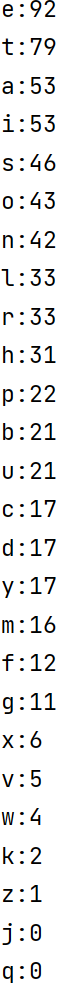 text = '''The Zen of Python, by Tim Peters Beautiful is better than ugly. Explicit is better than implicit. Simple is better than complex. Complex is better than complicated. Flat is better than nested. Sparse is better than dense. Readability counts. Special cases aren't special enough to break the rules. Although practicality beats purity. Errors should never pass silently. Unless explicitly silenced. In the face of ambiguity, refuse the temptation to guess. There should be one-- and preferably only one --obvious way to do it. Although that way may not be obvious at first unless you're Dutch. Now is better than never. Although never is often better than *right* now. If the implementation is hard to explain, it's a bad idea. If the implementation is easy to explain, it may be a good idea. Namespaces are one honking great idea -- let's do more of those! ''' text1 = text.lower() dict = {} for i in range(97,123): if chr(i) in text1: num = text1.count(chr(i)) dict.setdefault(chr(i),num) else: dict.setdefault(chr(i),0) sorted_values = sorted(dict.values(), reverse = True) sorted_dict = {} for i in sorted_values: for k in dict.keys(): if dict[k] == i: sorted_dict[k] = dict[k] for i in range(len(sorted_values)): print(f'{list(sorted_dict.keys())[i]}:{list(sorted_dict.values())[i]}')