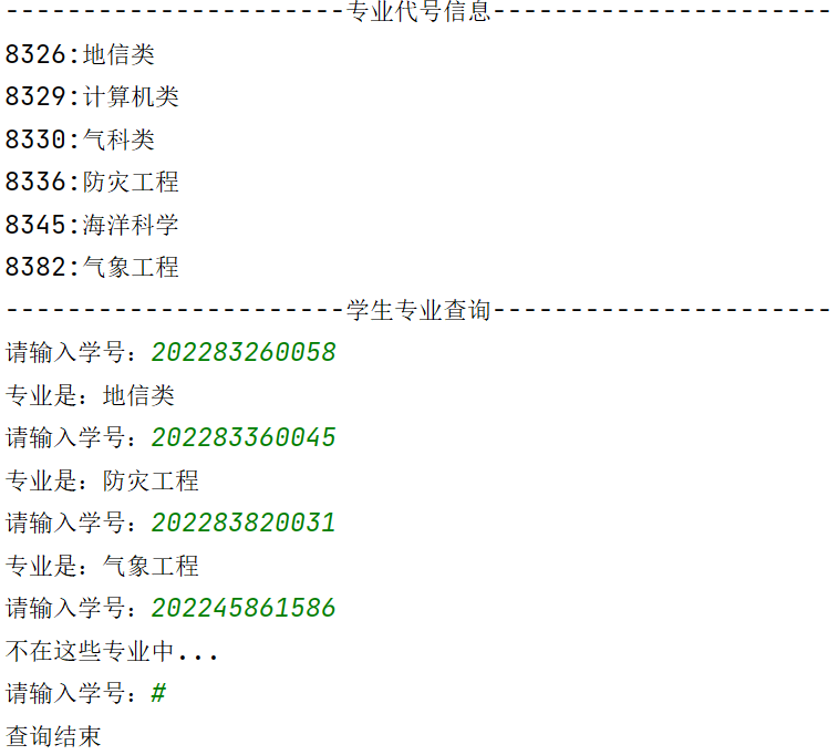 print('学生专业查询'.center(50, '-'))