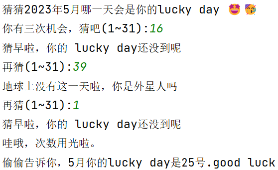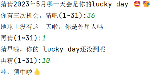 import random May_luckyday = random.randint(1,31) print(May_luckyday) print(f'猜猜2023年5月哪一天会是你的lucky day {chr(129321)}{chr(129395)}') day = int(input('你有三次机会,猜吧(1~31):')) for i in range(1,4): if 1<= day <= 31: if day == May_luckyday: print(f'哇,猜中啦{chr(128077)}') break elif day <= May_luckyday: print('猜早啦,你的 lucky day还没到呢') if i != 3: day = int(input('再猜(1~31):')) elif i == 3: print('哇哦,次数用光啦。') print(f'偷偷告诉你,5月你的lucky day是{May_luckyday}号.good luck') break else: print('猜晚啦,你的 lucky day过去了') if i != 3: day = int(input('再猜(1~31):')) elif i == 3: print('哇哦,次数用光啦。') print(f'偷偷告诉你,5月你的lucky day是{May_luckyday}号.good luck') break elif day < 1 or day >31: print('地球上没有这一天啦,你是外星人吗') if i != 3: day = int(input('再猜(1~31):')) elif i == 3: print('哇哦,次数用光啦。') print(f'偷偷告诉你,5月你的lucky day是{May_luckyday}号.good luck') break