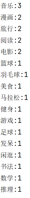 datas = {'2049777001': ['篮球', '羽毛球', '美食', '漫画'],