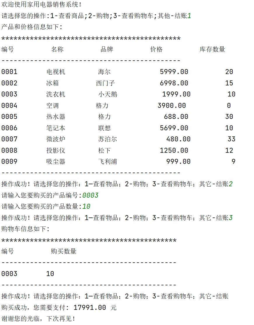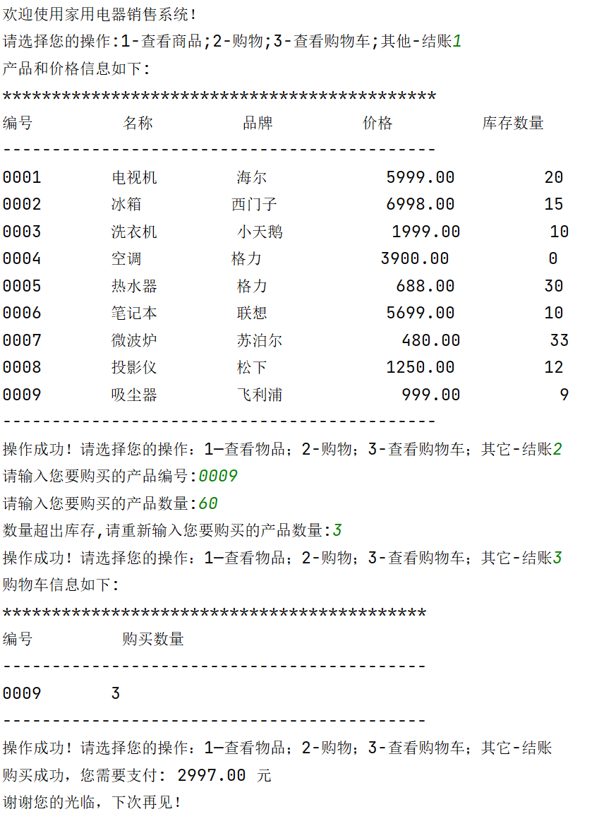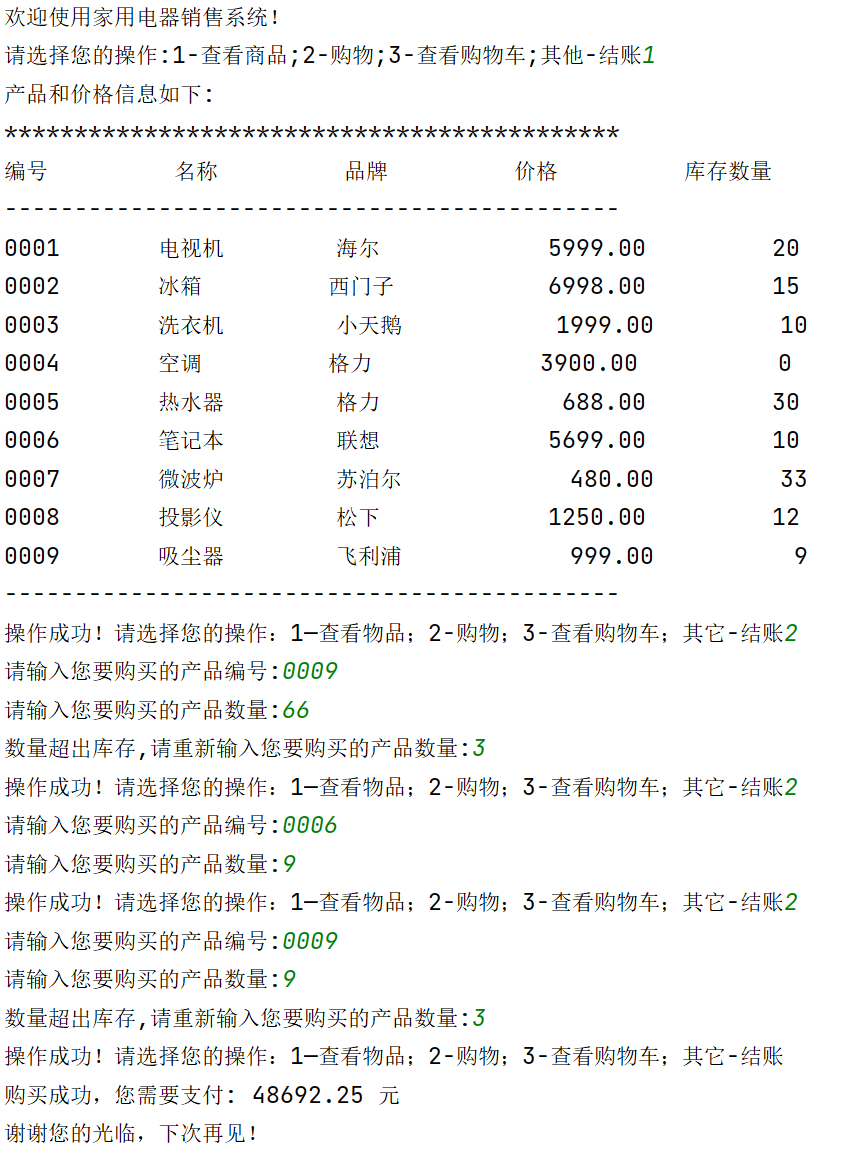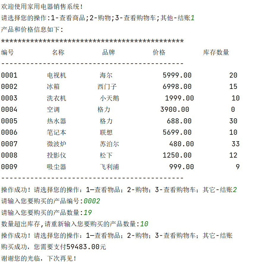 """ 家用电器销售系统 v1.3 """ #欢迎信息 print('欢迎使用家用电器销售系统!') #商品数据初始化 products=[ ['0001','电视机','海尔',5999.00,20], ['0002','冰箱','西门子',6998.00,15], ['0003','洗衣机','小天鹅',1999.00,10], ['0004','空调','格力',3900.00,0], ['0005','热水器','格力',688.00,30], ['0006','笔记本','联想',5699.00,10], ['0007','微波炉','苏泊尔',480.00,33], ['0008','投影仪','松下',1250.00,12], ['0009','吸尘器','飞利浦',999.00,9], ] #初始化用户购物车 products_cart=[] option=input('请选择您的操作:1-查看商品;2-购物;3-查看购物车;其他-结账') while option in ['1','2','3']: if option=='1': #产品信息列表 print('产品和价格信息如下:') print('********************************************') print('%-10s'%'编号','%-10s'%'名称','%-10s'%'品牌','%-10s'%'价格','%-10s'%'库存数量') print('--------------------------------------------') for i in range(len(products)): print ( '%-10s'%products[i][0],'%-10s'%products[i][1],'%-10s'%products[i][2],'%10.2f'%products[i][3],'%10d'%products[i][4]) print('--------------------------------------------') elif option=='2': product_id= input('请输入您要购买的产品编号:') while product_id not in[item[0] for item in products]: product_id=input('编号不存在,请重新输入您要购买的产品编号:') count=int(input('请输入您要购买的产品数量:')) while count> products[int( product_id)-1][4]: count=int(input('数量超出库存,请重新输入您要购买的产品数量:')) #将所购买商品加入购物车 if product_id not in [item[0] for item in products_cart]: products_cart.append([product_id,count]) else: for i in range(len(products_cart)): if products_cart[i][0]==product_id: products_cart[i][1]+=count #更新商品列表 for i in range(len(products)): if products[i][0]==product_id: products[i][4]-=count else: print('购物车信息如下:') print('*******************************************') print('%-10s'%'编号','%-10s'%'购买数量') print('-------------------------------------------') for i in range(len(products_cart)): print('%-10s'%products_cart[i][0],'%-10s'%products_cart[i][1]) print('-------------------------------------------') option=input('操作成功!请选择您的操作:1—查看物品;2-购物;3-查看购物车;其它-结账') #计算金额 if len( products_cart)>0: amount=0 for i in range( len( products_cart)): product_index=0 for j in range(len(products)): if products[j][0]== products_cart[i][0]: product_index=j break price= products[ product_index][3] count= products_cart[i][1] amount+=price*count if 5000<amount<=10000: amount=amount*0.95 elif 10000<amount <=20000: amount=amount*0.90 elif amount>20000: amount=amount*0.85 else: amount=amount*1 print('购买成功,您需要支付:','{:.2f}'.format(amount),'元') #退出系统 print('谢谢您的光临,下次再见!')