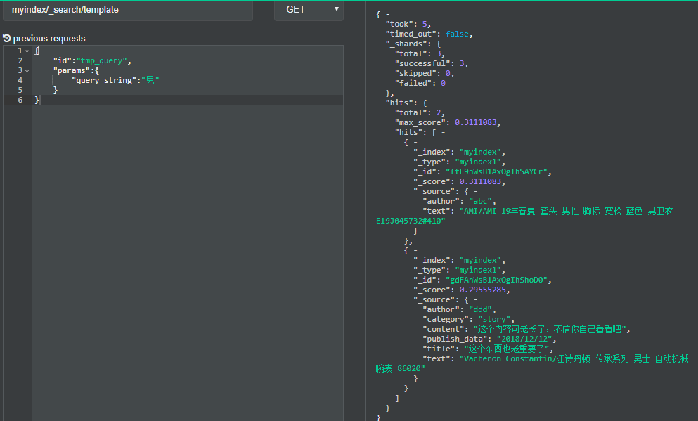 1 { 2 "id":"tmp_query", 3 "params":{ 4 "query_string":"文本" 5 } 6 }