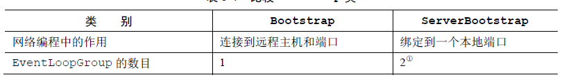 Netty 的引导类为应用程序的网络层配置提供了容器,这涉及将一个进程绑定到某个指定的端口,或者将一个进程连接到另一个运行在某个指定主机的指定端口上的进程。通常来说,我们把前面的用例称作引导一个服务器,后面的用例称作引导一个客户端。 用于客户端(简单地称为Bootstrap),(ServerBootstrap)用于服务器。