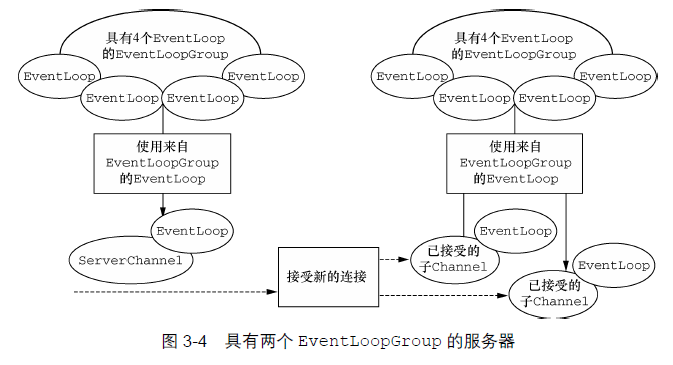 与ServerChannel 相关联的EventLoopGroup 将分配一个负责为传入连接请求创建Channel 的EventLoop。一旦连接被接受,第二个EventLoopGroup 就会给它的Channel