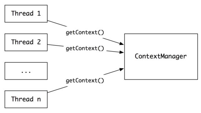 我们设计一个ContextManager,用来管理所有的context。他可能是一个单例(singleton)模式,也可能提供静态(static)方法,反正不管如何,全局都可以访问,我们这里为了说明简单,就假定是用static方法。然后请求的处理线程在接收到任务的时候,就调用这个ContextManager的getContext()方法,提供给这个线程一个context,然后线程对这个context做初始化等等操作,供后续使用。