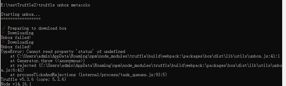 最近来新公司需要研究一下区块链,然后再window 的dos界面执行 truffle unbox metacoin 一直报错