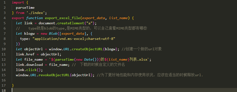 1 import { parseTime} from './index'; // 这是是一个格式化时间的方法。可以删除 2 export function export_excel_file(export_data, list_name) { 3 let link = document.createElement("a"); 4 // type就是blob的type,是MIME类型的,可以自己查看MIME类型都有哪些 5 let blogw = new Blob([export_data], { 6 type: "application/vnd.ms-excel;charset=utf-8" 7 }) 8 let objectUrl = window.URL.createObjectURL(blogw); //创建一个新的url对象 9 link.href = objectUrl; 10 let file_name = `${parseTime(new Date())}的${list_name}列表.xlsx`; // 文件名的输出方式,随意就好 12 link.download = file_name; // 下载的时候自定义的文件名 13 link.click(); 14 window.URL.revokeObjectURL(objectUrl); //为了更好地性能和内存使用状况,应该在适当的时候释放url. 15 16 }