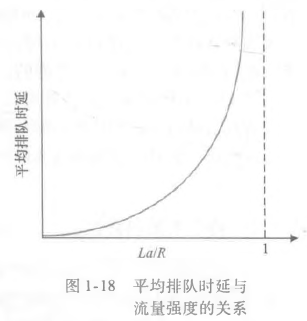 前面说的丢包也可以用上面提到的流量强度来解释。分组丢包的比例会随着流量强度增加而增加。