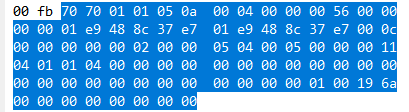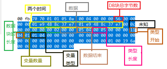 大概推测如下:首先前面的7070是块头,0a应该表示的是数据块,而0004表示的是number,也就是数据块号,后面的00000056表示的是这个DB块的总字节数。第二行的应该是和时间相关的一段字节码。第三行开始应该就是固定的一些样式了。前面的四个字节00还不知道是什么意思。