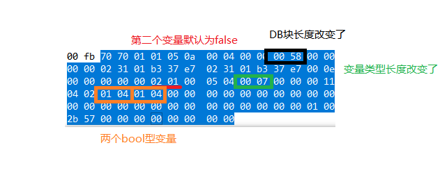 而第三行的0002应该表示的是DB块存放的数据的大小,因为只有一个变量,所以这里就用两个字节来表示,这两个字节是0000,因为默认为false状态,所以值为0。