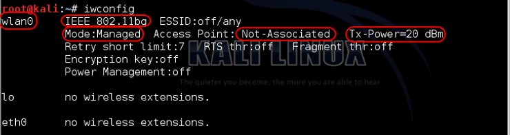 正如您在上面看到的,此命令提供了有关我们无线设备的大量信息。正如我们所料,唯一具有无线扩展功能的网络接口是 wlan0。在该段中,我们了解了我们的设备能够支持的 801.11 标准 (bg),它处于Mode:Magaged(这与大多数无线攻击所需的监视器或混杂模式形成对比),它与接入点(AP),它的功率是 20dBm。我们将在无线黑客部分花更多时间处理这些信息。