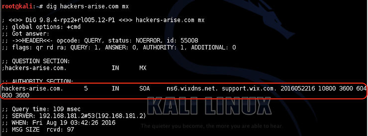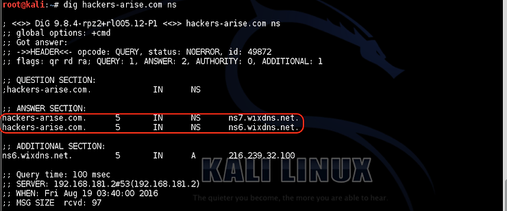 对于有抱负的黑客来说,最有用的命令之一是dig,它相当于Windows 中的nslookup,但为我们提供了更多关于域的信息。例如,如果我们挖掘hackers-arise.com并通过添加ns选项,它将显示hackers-arise.com 的名称服务器。