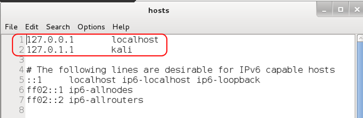 默认情况下,此文件只有我们的本地主机位于 127.0.0.1 和 Kali 位于 127.0.1.1。我们可以添加我们想要的任何 IP/域映射。例如,在我的 dnsspoof 教程中,我们将 bankofamerica.com 映射到我们的本地网站,比如 192.168.181.131。然后,这会将我们用于 bankofamerica.com 的流量定向到我们的 Web 服务器,如果我们使用 dnspoof,它会将我们 LAN 上的任何人定向到我们位于 192.168.181.131 的 Web 服务器。