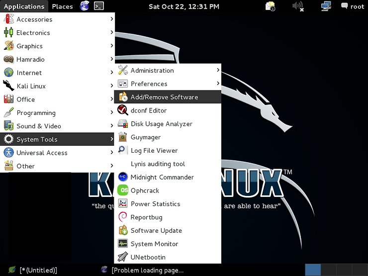 除了用于下载和安装新软件的命令行工具外,Kali 和其他带有 GUI 的 Linux 版本通常都有一个基于 GUI 的工具来安装和删除软件。在 Kali 1.1 中,我们可以转到应用程序 --> 系统工具 -- 添加/删除软件,如下所示。