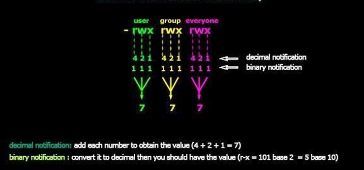 如果你把这三个加起来,你会得到七个,对吧?在 Linux 中,当所有的权限开关都打开时,我们可以用等价于 7 的十进制数字来表示。因此,如果我们要表示所有者(7)和组(7)以及所有用户(7)拥有所有permissions,我们可以将其表示为:777