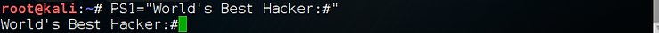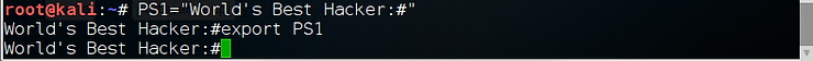 请记住,每当我们打开第一个终端 (PS1) 时,我们的提示现在将是“World's Best Hacker”,但第二个终端仍将是默认命令提示。这意味着,如果我们真的喜欢这个新的命令提示符并想保留它,我们需要将它导出,这样每次我们打开这个终端或任何终端时,提示符都会是“World's Best Hacker: #”