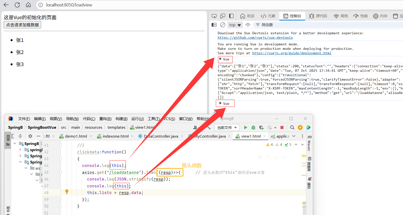 axios.get("/loaddataone").then((resp)=>{ // 箭头函数的“this"指的是vue对象