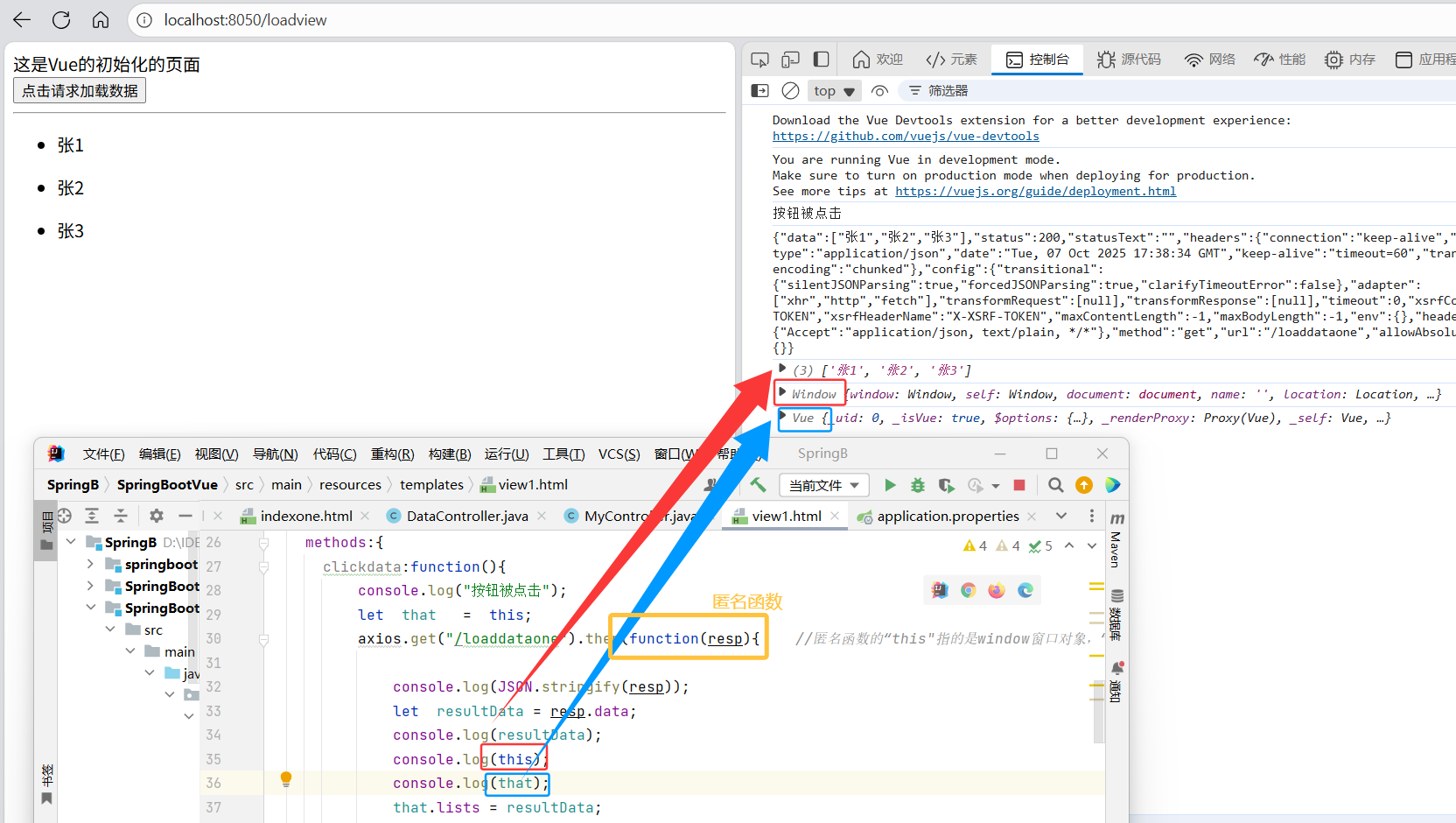 // axios.get("/loaddataone").then(function(resp){ 匿名函数的“this"指的是window窗口对象,“that"指的是vue对象