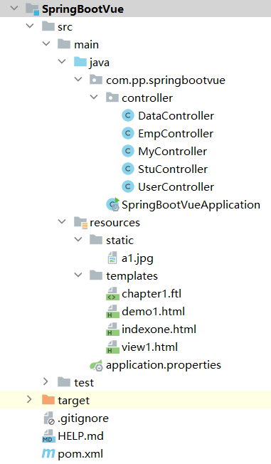 src/main/java:存放 Java 代码,包含多个控制器类(如DataController、EmpController等)以及启动类SpringBootVueApplication。src/main/resources:static:存放静态资源,如图片a1.jpg。templates:存放视图模板,包含 Thymeleaf 模板(如demo1.html)和 Freemarker 模板(如chapter1.ftl)。application.properties:SpringBoot 配置文件。pom.xml:管理项目依赖。