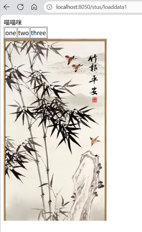 访问 http://localhost:8050/stus/loaddata1,Thymeleaf 模板会将控制器传递的数据渲染成 HTML 页面,展示文本、表格和图片内容。