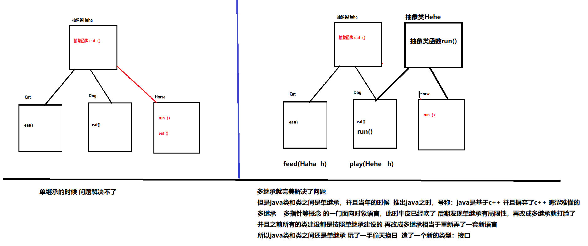 此时我们就需要给 马和狗 找一个公共 父类,但是java中类和类之间的关系是单继承,并且狗已经有父类Haha了 ,而且不能变了(狗的父类Haha是为了和Cat有公共父类产生多态) 马也只能添加父类Haha