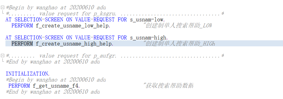 *INITIALIZATION 上面写定义,AT SELECTION-SCREEN ON VALUE-REQUEST FOR S_USNAM(选择屏幕参数)-low(high).