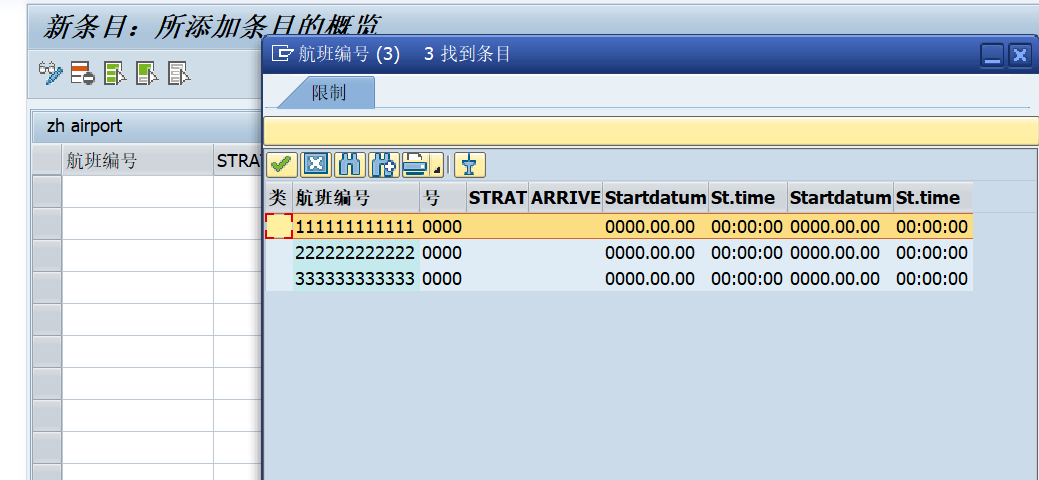 *&---------------------------------------------------------------------* *& 包含 ZIZ_ADD_F4*如果要多字段搜索帮助,在屏幕流加多个FIELD xxx,在这里增加多个MODULE即可,可以一个字段一个MODULE,一个FIELD xxx*如果搜索帮助弹框字段是F000几,多字段会递增,说明是翻译问题,为翻译自动替换F000几 *&---------------------------------------------------------------------* MODULE fr_add_no_f4 input. TYPES: BEGIN OF tys_w, FILGHT_NO TYPE ZZE_WT-FILGHT_NO, END OF tys_w.*gt_out有几个字段,搜索帮助就显示几个字段,可定义或者参考 DATA: gt_out TYPE TABLE OF ZZE_WT, gs_out TYPE ZZE_WT."查询加入数据,此例子手动append * SELECT CONNID FROM ZAH_VIEW INTO CORRESPONDING FIELDS OF TABLE gt_out. * SORT gt_out BY CONNID. * DELETE ADJACENT DUPLICATES FROM gt_out COMPARING CONNID. gs_out-filght_no = '111111111111'. APPEND gs_out TO gt_out. CLEAR gs_out. gs_out-filght_no = '222222222222'. APPEND gs_out TO gt_out. CLEAR gs_out. gs_out-filght_no = '333333333333'. APPEND gs_out TO gt_out. CLEAR gs_out. SORT gt_out BY filght_no. DELETE ADJACENT DUPLICATES FROM gt_out COMPARING filght_no. CALL FUNCTION 'F4IF_INT_TABLE_VALUE_REQUEST' EXPORTING RETFIELD = 'FILGHT_NO' "返回字段名(通过sql查询出的字段名) DYNPPROG = SY-REPID "当前程序 DYNPNR = SY-DYNNR "Dynpro编号 DYNPROFIELD = 'FILGHT_NO' "Dynpro值返回字段的名称(带搜索帮助的字段名) VALUE_ORG = 'S' "价值转移:C:逐个单元格,S:结构化 TABLES VALUE_TAB = gt_out "查询表 EXCEPTIONS PARAMETER_ERROR = 1 NO_VALUES_FOUND = 2 OTHERS = 3. ENDMODULE.