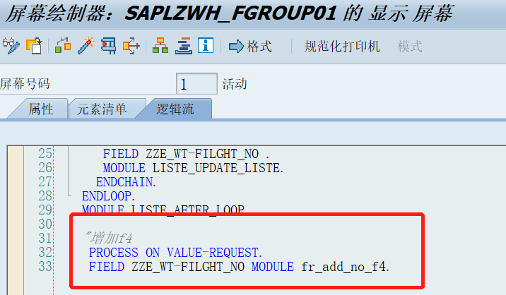 双击概述屏幕 的屏幕号,进入屏幕逻辑流,增加代码如下