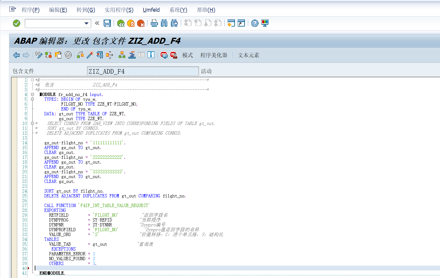 FIELD ZZE_WT-FILGHT_NO MODULE fr_add_no_f4."ZZE_WT-FILGHT_NO是要加搜索帮助的字段
