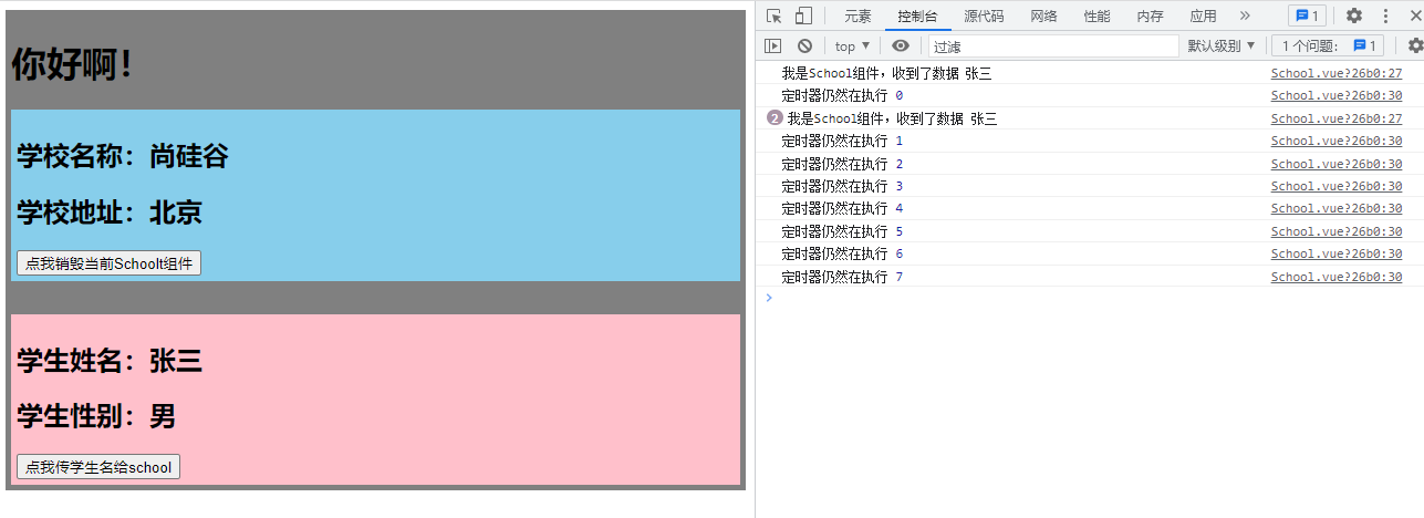 定时器在mounted()生命周期函数中运行,此时点击传学生名给school按钮,可以触发自定义事件,(此时school组件没有销毁),当销毁school组件按钮后,定时器仍然运行,但是无法传学生名给school组件