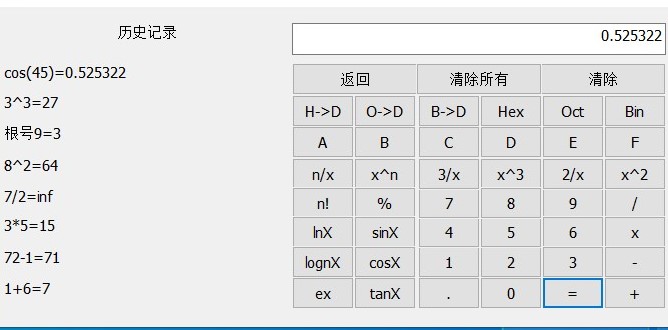 // test_computerDlg.h: 头文件//#pragma once//运算符enum Calculator_Flag { FLAG_JIA, FLAG_JIAN, FLAG_CHENG, FLAG_CHU, FLAG_NFANG, //n方 FLAG_KAINFANG, //开n方 FLAG_PINGFANG,//平方 FLAG_KAIFANG,//开方 FLAG_LIFANG,//立方 FLAG_KAILIFANG,//开立方 FLAG_EX, //e的x次方 FLAG_SIN,//正弦 FLAG_COS,//余弦 FLAG_TAN,//正切 FLAG_MOD, //模运算 FLAG_N, //n的阶乘 FLAG_LNX, //以10为低的对数 FLAG_LOGNX,//对数运算 FLAG_HD,//十六进制到十进制 FLAG_OD,//八进制到十进制 FLAG_BD,//二进制到十进制 FlAG_HEX,//十六进制 FLAG_OCT,//八进制 FLAG_BIN//二进制};// CtestcomputerDlg 对话框 用户界面类以及类中的函数和变量class CtestcomputerDlg : public CDialogEx{// 构造public: CtestcomputerDlg(CWnd* pParent = nullptr); // 标准构造函数 void SaveFirstValue();//保存第一个输入值 void Calculator();//计算// 对话框数据#ifdef AFX_DESIGN_TIME enum { IDD = IDD_TEST_COMPUTER_DIALOG };#endif protected: virtual void DoDataExchange(CDataExchange* pDX); // DDX/DDV 支持// 实现protected: HICON m_hIcon; // 生成的消息映射函数 virtual BOOL OnInitDialog(); afx_msg void OnSysCommand(UINT nID, LPARAM lParam); afx_msg void OnPaint(); afx_msg HCURSOR OnQueryDragIcon(); DECLARE_MESSAGE_MAP()//控件的变量,,,即输入框的变量 在这里声明后需要在test_computerDlg.cpp文件中关联private: CString mStr;//编辑框1内的字符串 CString mStr1;//编辑框2内的字符串 CString mStr2; CString mStr3; CString mStr4; CString mStr5; CString mStr6; CString mStr7; CString mStr8; CString mTempStr;///中间变量 double mNum1;//运算数 double mNum2; Calculator_Flag mFlag;//运算符号public: //点击按钮自动生成的函数声明,函数原型在test_computerDlg.cpp文件中 //这些都是按钮你的消息处理函数 afx_msg void OnBnClickedButton6(); afx_msg void OnBnClickedButton43(); afx_msg void OnBnClickedButton42(); afx_msg void OnBnClickedButton36(); afx_msg void OnBnClickedButton37(); afx_msg void OnBnClickedButton38(); afx_msg void OnBnClickedButton30(); afx_msg void OnBnClickedButton31(); afx_msg void OnBnClickedButton32(); afx_msg void OnBnClickedButton24(); afx_msg void OnBnClickedButton25(); afx_msg void OnBnClickedButton26(); afx_msg void OnBnClickedButton1(); afx_msg void OnBnClickedButton3(); afx_msg void OnBnClickedButton2(); afx_msg void OnBnClickedButton45(); afx_msg void OnBnClickedButton44(); afx_msg void OnBnClickedButton10(); afx_msg void OnBnClickedButton11(); afx_msg void OnBnClickedButton12(); afx_msg void OnBnClickedButton13(); afx_msg void OnBnClickedButton14(); afx_msg void OnBnClickedButton15(); afx_msg void OnBnClickedButton39(); afx_msg void OnBnClickedButton33(); afx_msg void OnBnClickedButton27(); afx_msg void OnBnClickedButton21(); afx_msg void OnBnClickedButton20(); afx_msg void OnBnClickedButton19(); afx_msg void OnBnClickedButton18(); afx_msg void OnBnClickedButton17(); afx_msg void OnBnClickedButton16(); afx_msg void OnBnClickedButton23(); afx_msg void OnBnClickedButton34(); afx_msg void OnBnClickedButton41(); afx_msg void OnBnClickedButton35(); afx_msg void OnBnClickedButton29(); afx_msg void OnBnClickedButton28(); afx_msg void OnBnClickedButton40(); afx_msg void OnBnClickedButton22(); afx_msg void OnBnClickedButton4(); afx_msg void OnBnClickedButton5(); afx_msg void OnBnClickedButton7(); afx_msg void OnBnClickedButton8(); afx_msg void OnBnClickedButton9();}; |
