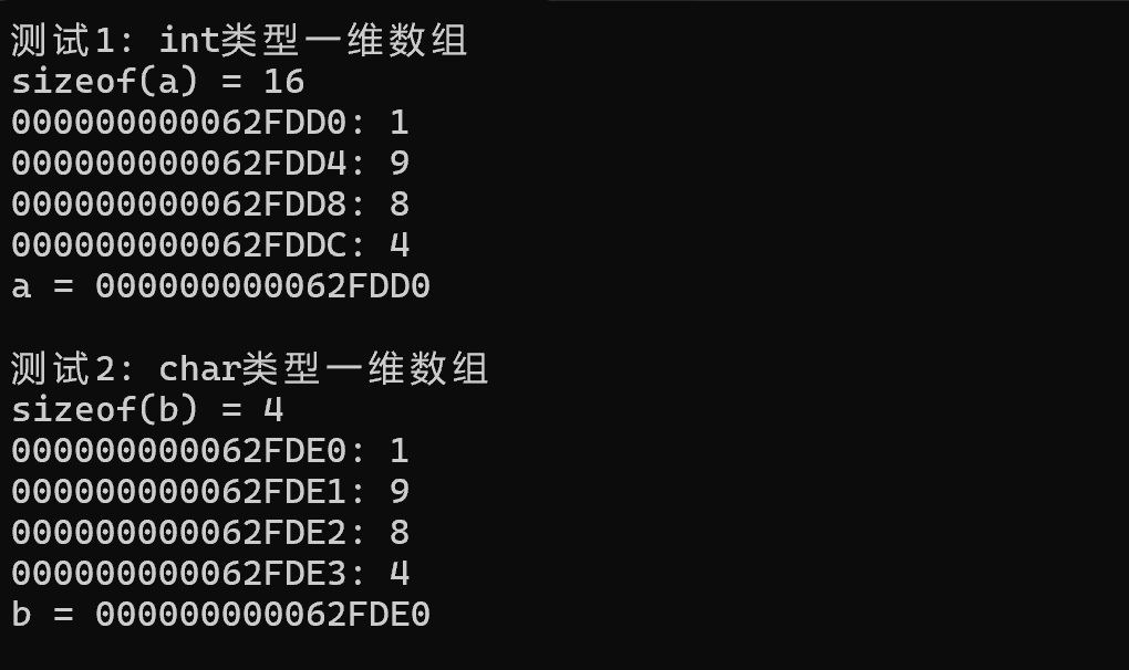 char型数组b在内存中是连续存放的,每个元素占用4个内存字节单元,数组名b对应的值和&b[0]是一样的。