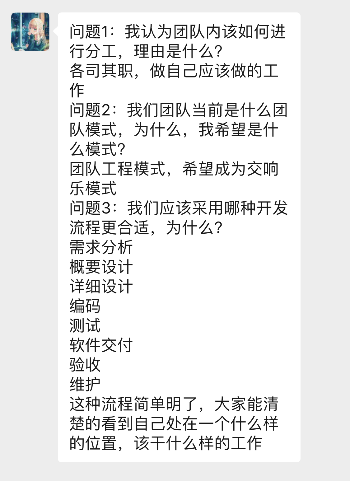 3.给出团队成员发布到团队沟通群的对问题1、2、3的思考的截图。