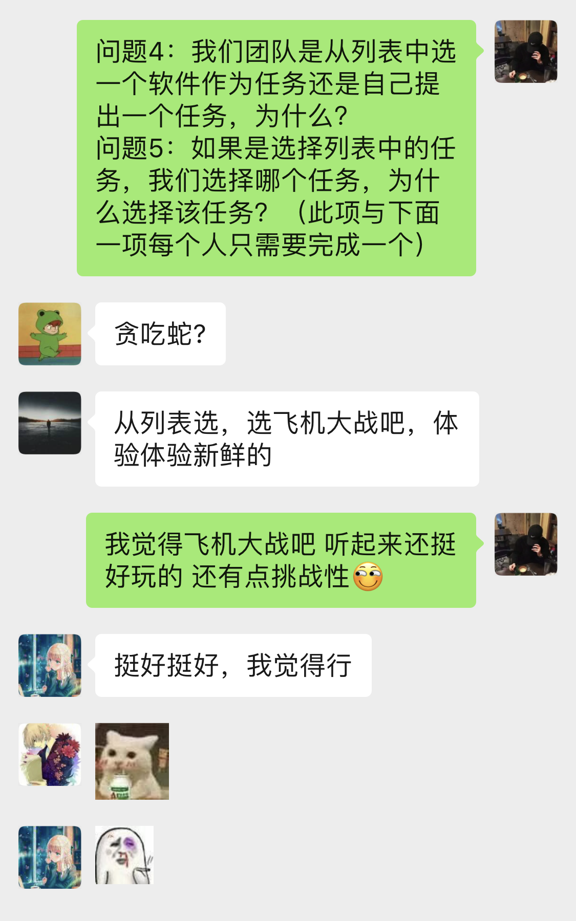 团队最终确定开发的软件为:飞机大战,讨论过程中没有任何不同意见,一致认为开发飞机大战接近我们团队现阶段所能达到的目标,而且在开发的过程中具有一定的挑战性和趣味性。