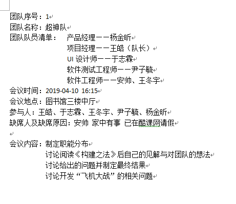 1.会议基本信息。必须包括:团队序号、队伍名称、团队成员清单(标注出队长)、会议召开的时间、地点、参与人、缺席人及缺席原因、会议照片、此博客的撰写人。